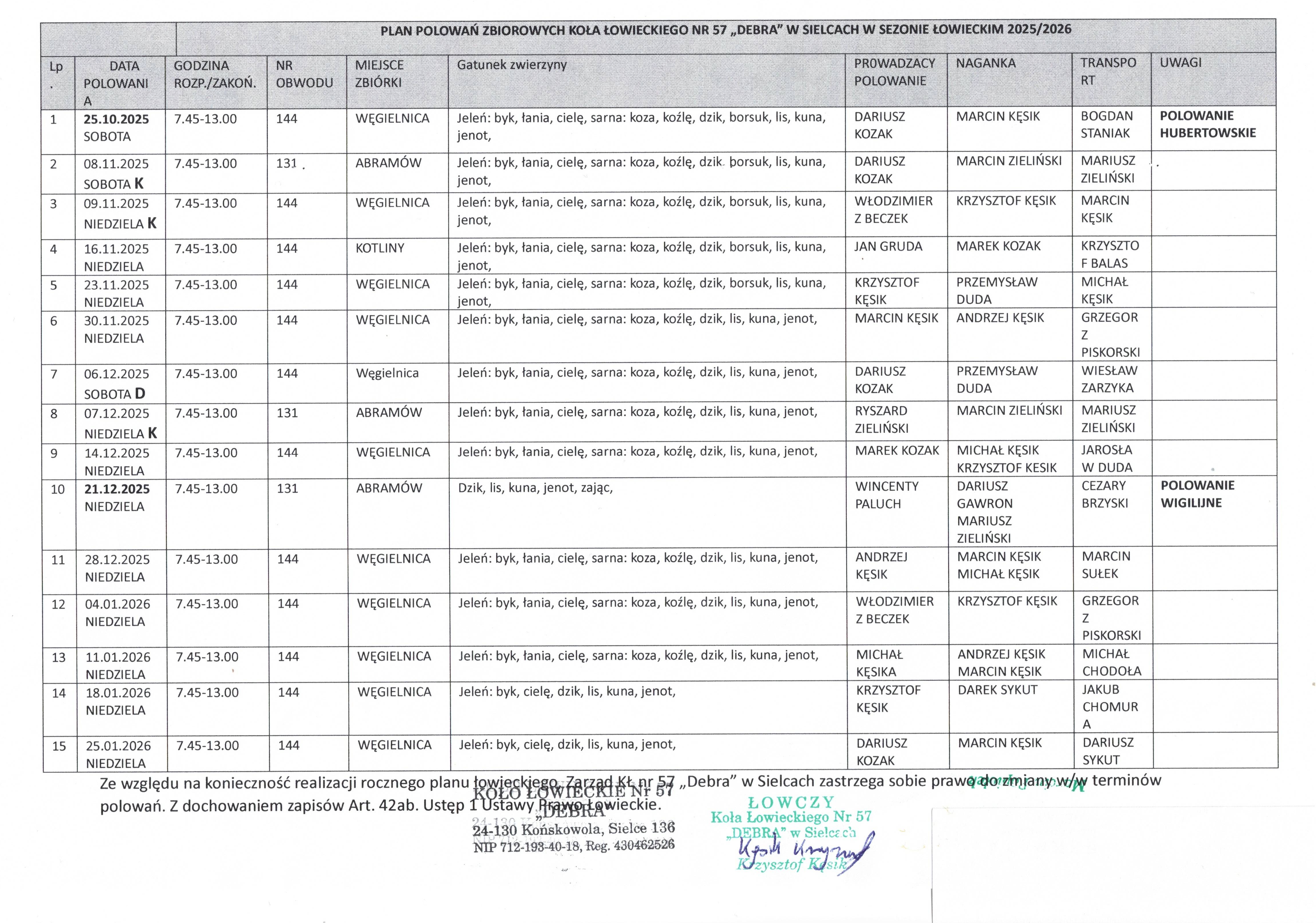 Plan polowań zbiorowych Koła Łowieckiego Nr 57 "Debra" w Sielcach