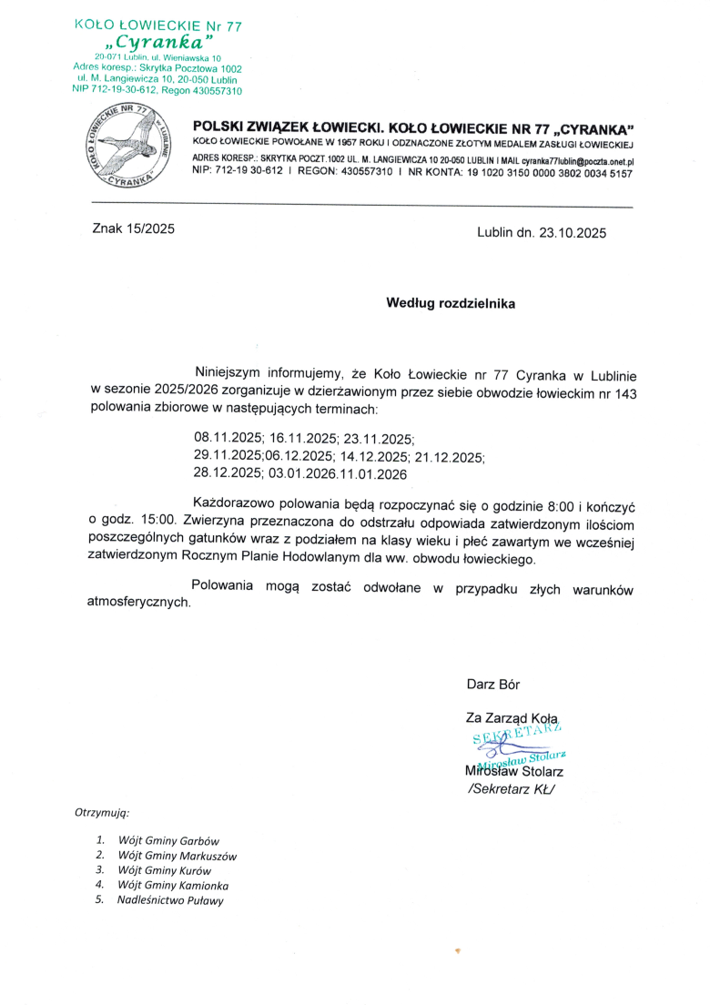 Plan polowań zbiorowych Koło Łowieckie nr 77 "Cyranka"